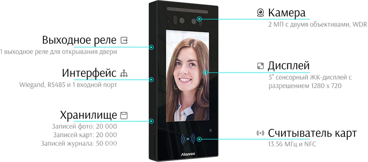 - Встроенная память на 20 000 лиц и 20 000 карт.