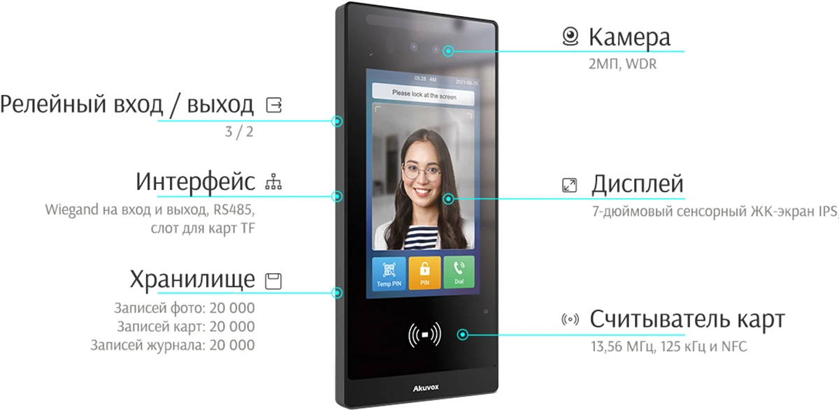 - Встроенная память на 20 000 лиц и 20 000 карт.