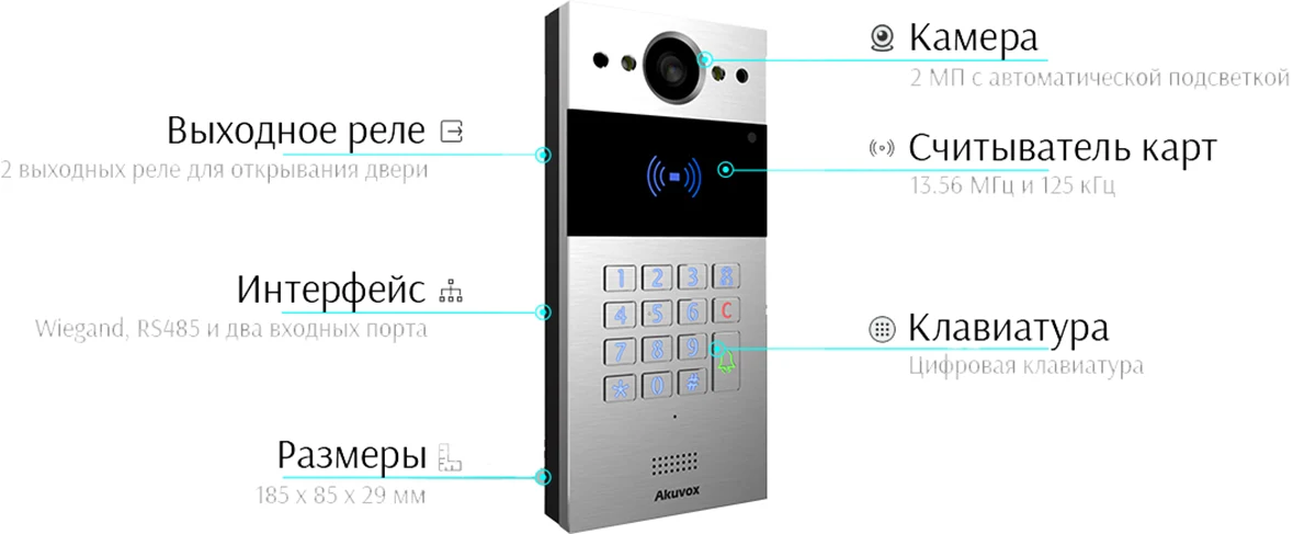 Akuvox R20K — одна из самых компактных и экономичных многоабонентских вызывных панелей на рынке. Благодаря небольшим габаритам она легко устанавливается в местах, где другие модели не помещаются. При доступной стоимости это полнофункциональное SIP-устройство, идеально подходящее для контроля доступа в подъезды многоквартирных домов и офисных зданий.
