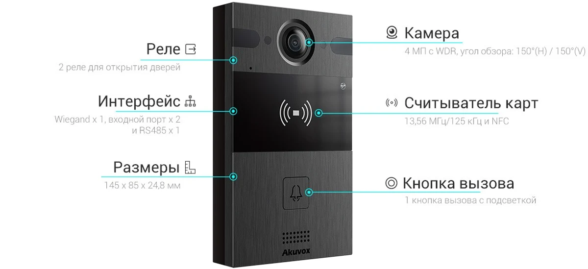 - Кнопка вызова с синей подсветкой и возможность удаленного контроля через веб-интерфейс.